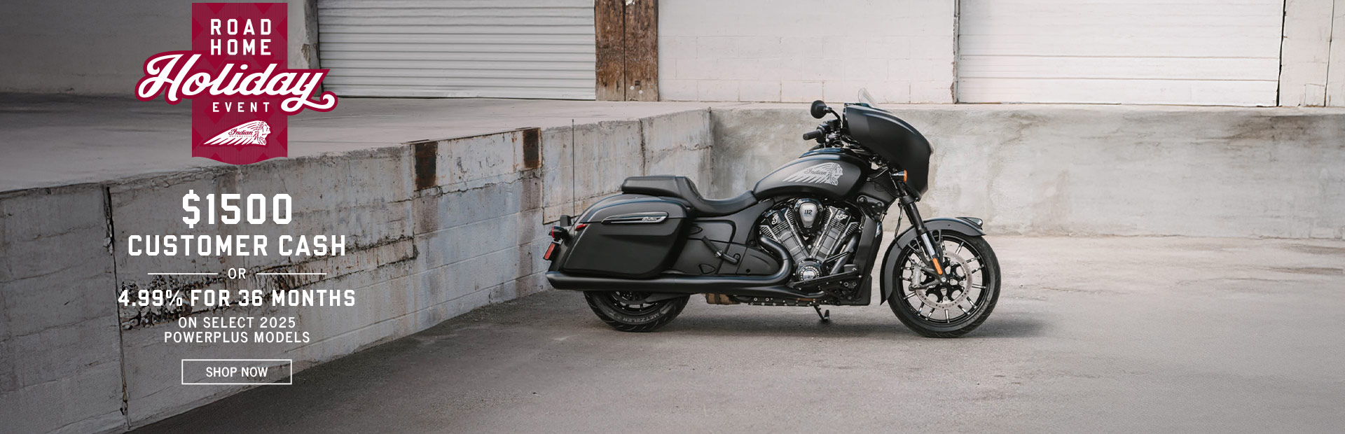 This is a limited time offer which consists of $1,500 Customer Cash rebate towards the purchase of new model year 2025 Chieftain PowerPlus, Chieftain PowerPlus Limited, Roadmaster PowerPlus Dark Horse or Roadmaster PowerPlus Limited models. This offer is subject to change and may be extended or terminated without further notice. Offer may not be combined with promotional financing offers. All rebates paid to dealer and are not redeemable for cash. Offer Valid: December 1 – 31, 2025."